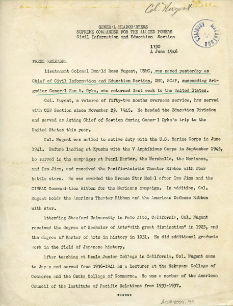 Papers of Lieutenant Colonel Donald M. Nugent, USMC, Civil Information and Education Section, SCAP.