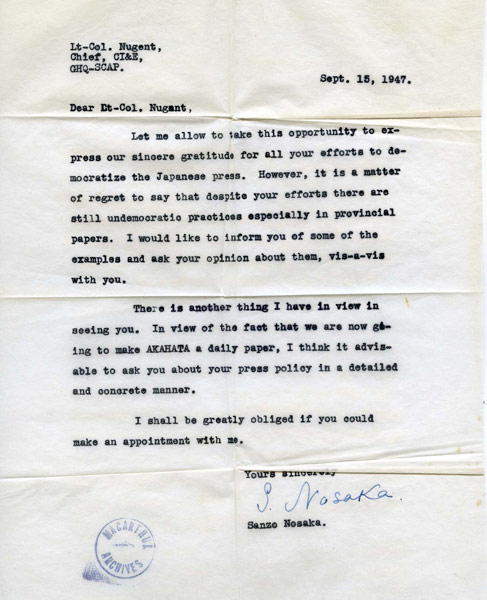 Letter from Sanzo Nosaka, Chief of the Japanese Communist Party, to Lt. Col. Nugent